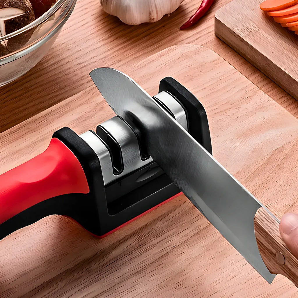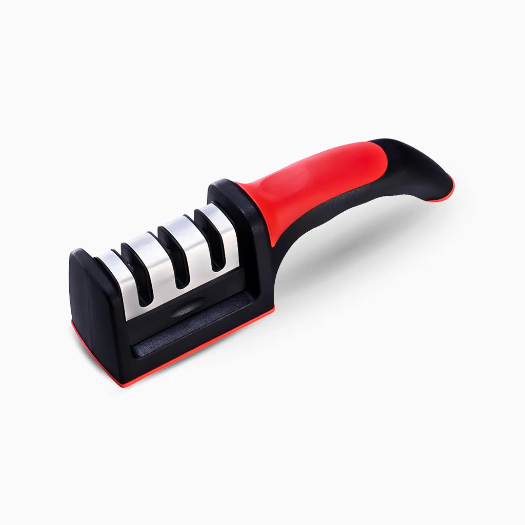 - Base de Aço Inoxidável: A base do afiador é feita de aço inoxidável de alta qualidade, garantindo durabilidade e resistência a desgastes.