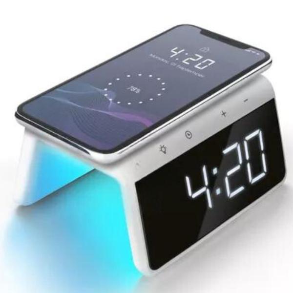 Chegou a nova base de carregamento sem fio com relógio digital, despertador e luminária.
