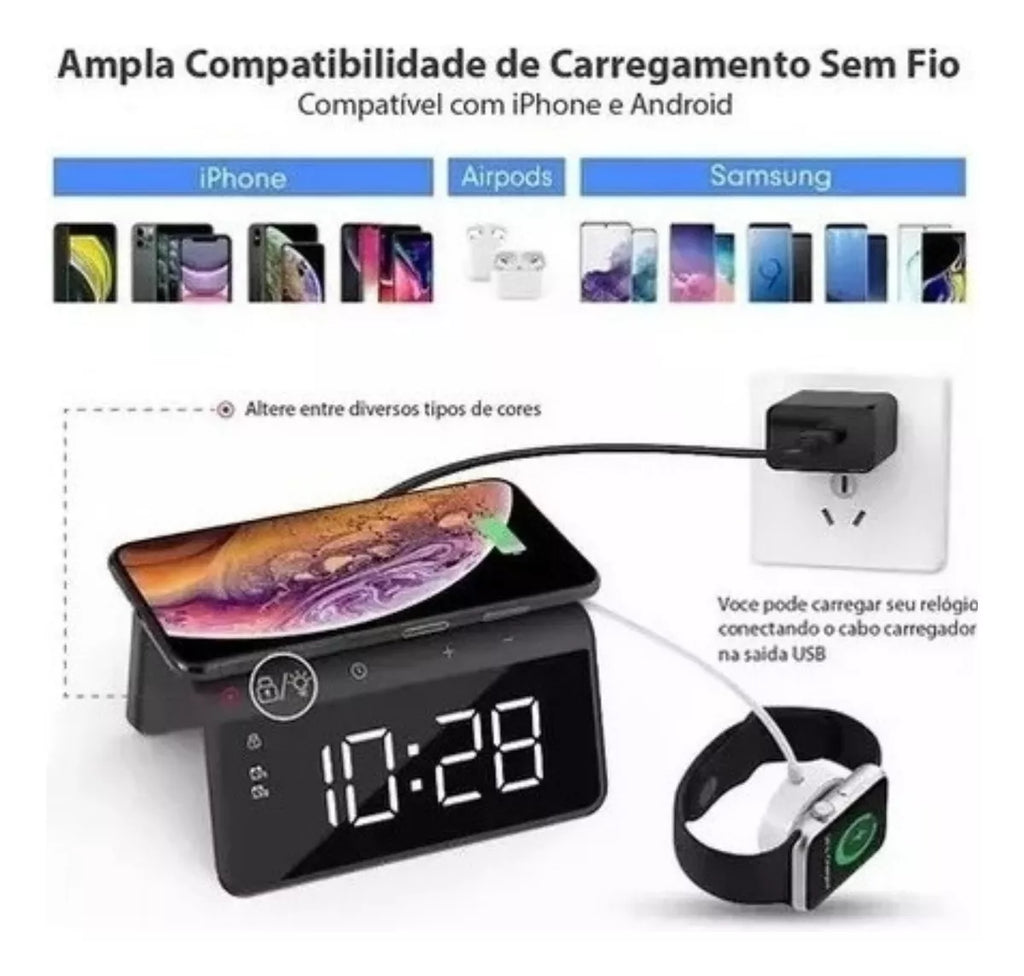 O carregador é compatível com Samsung, iPhone, Airpods, e demais modelos(com tecnologia por indução). Também conta com relógio digital com despertador, luminária em até 8 cores diferentes, e ajuste de brilho.
