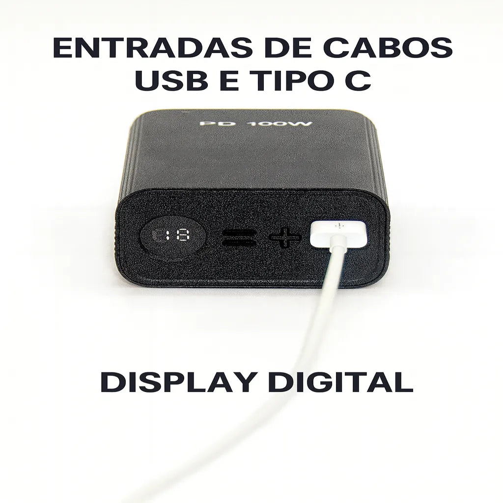 Entradas e Saídas: USB e Type-C, possibilitando carregar vários dispositivos simultaneamente.