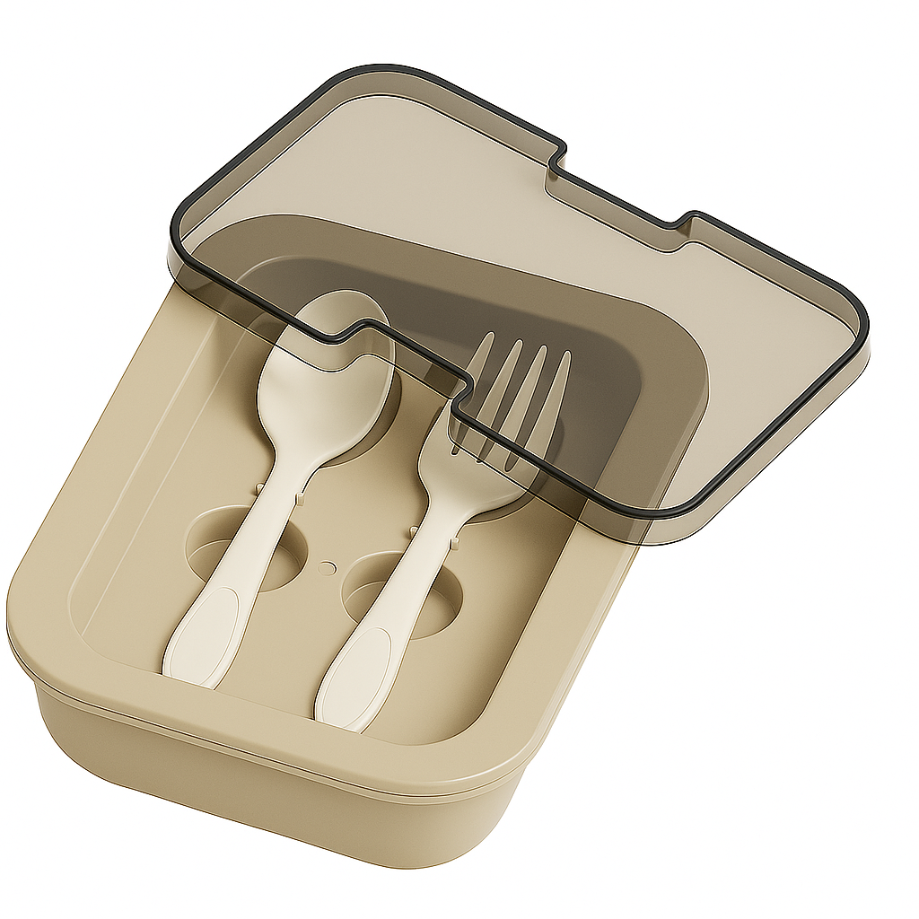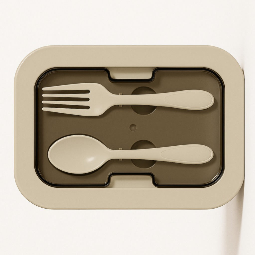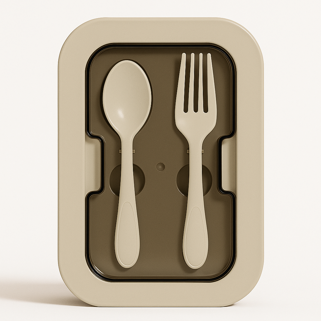 Talheres sempre com você: inclui colher e garfo reutilizáveis encaixados na tampa – organizados e prontos para o uso.