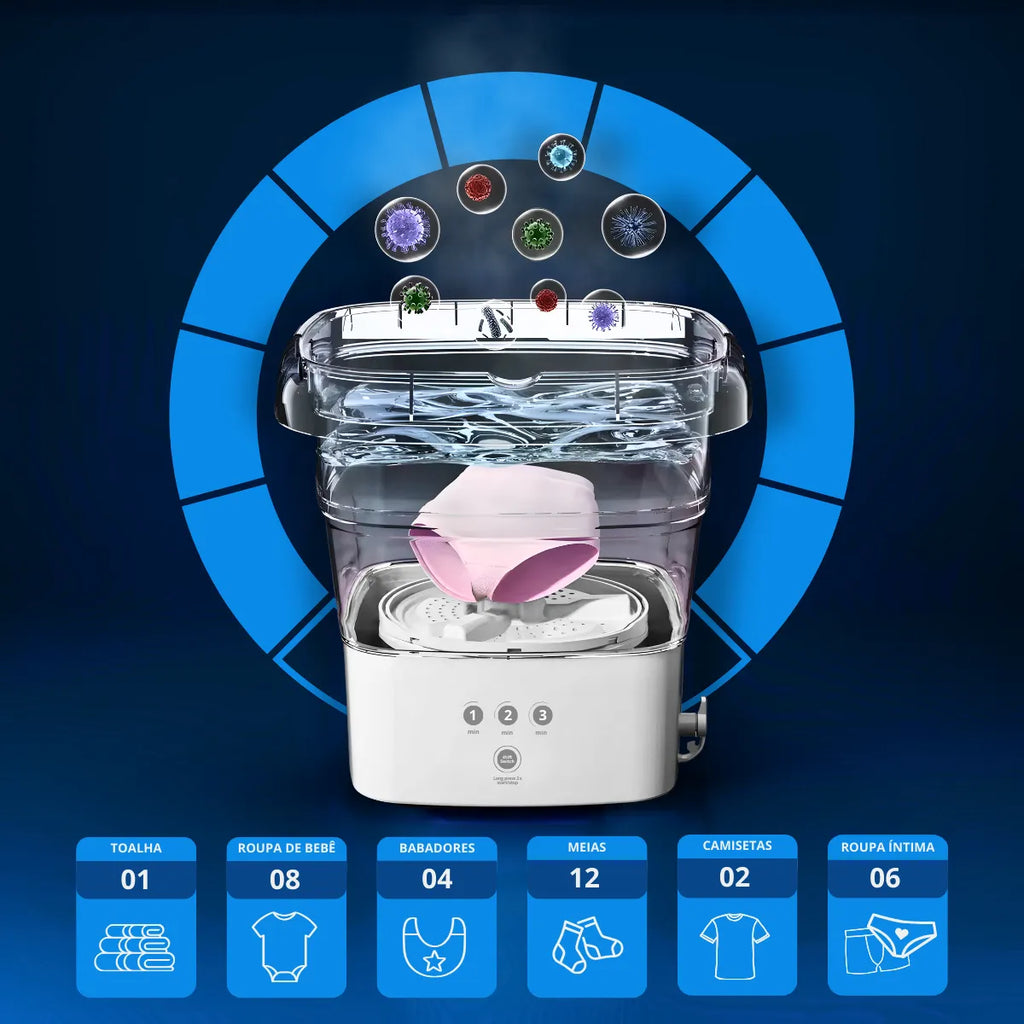 - Capacidade Surpreendente: Compacta, mas com capacidade para lavar até 1 kg de roupas. Ideal para itens íntimos e roupas de bebê, permitindo trocas diárias sem acúmulo de lavanderia.