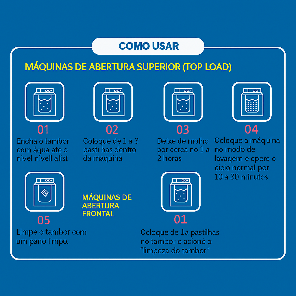 Elas foram desenvolvidas com uma fórmula poderosa antibacteriana, que remove sujeiras acumuladas no tambor e partes internas da máquina, garantindo uma lavagem mais eficiente e prolongando a vida útil do seu equipamento.