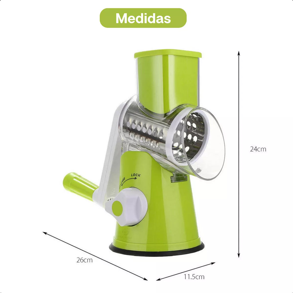 O fatiador / ralador cortador de legumes giratório manual é um utensílio multiuso que facilita o seu dia a dia no preparo das refeições. Ele conta com 3 tambores de lâminas em aço inox, é lavável, prático para limpar e higienizar, pois é totalmente desmontável.
