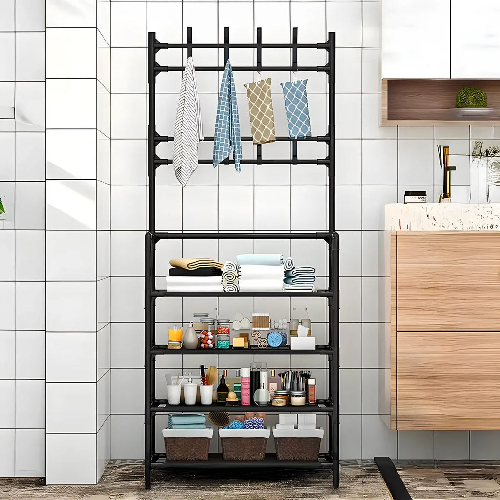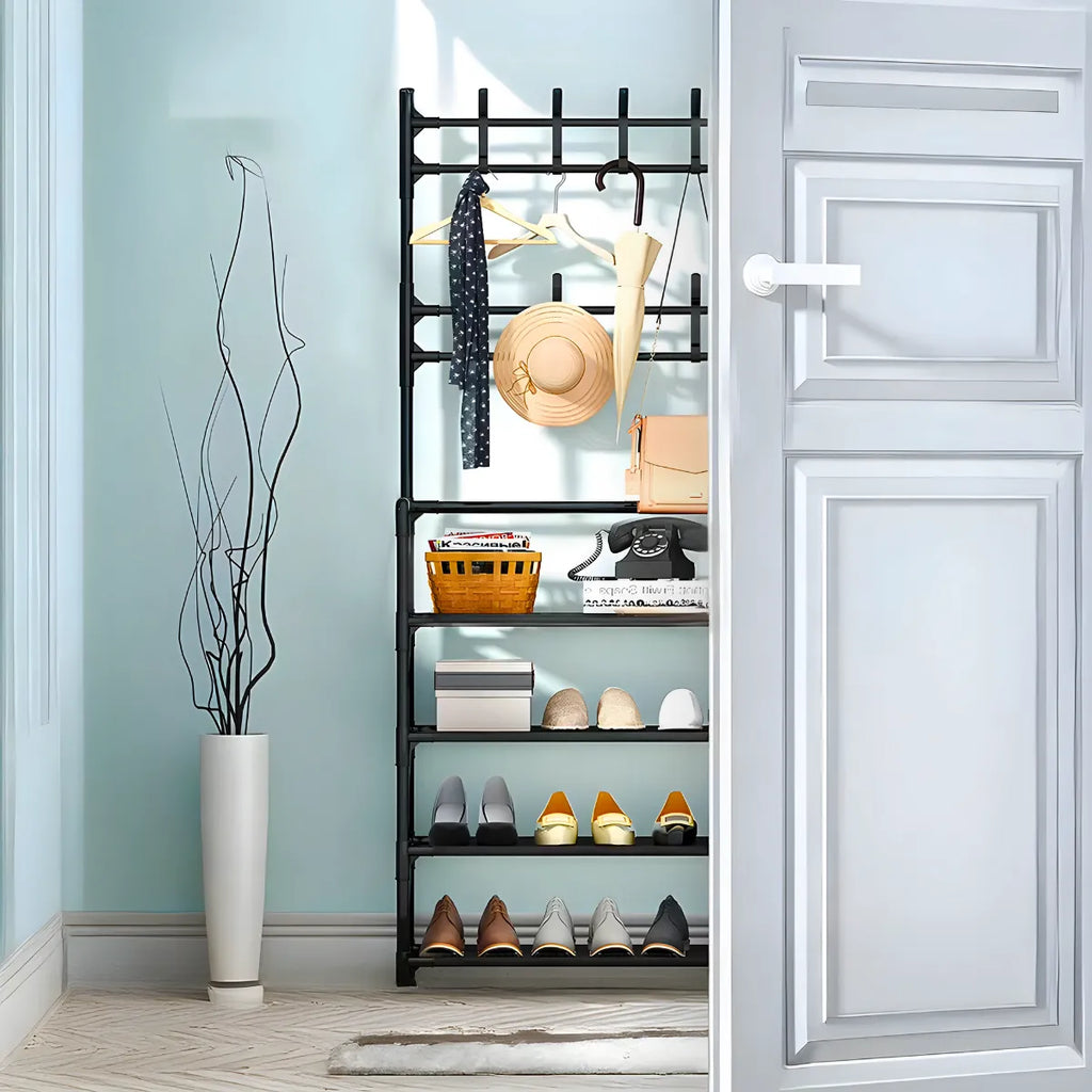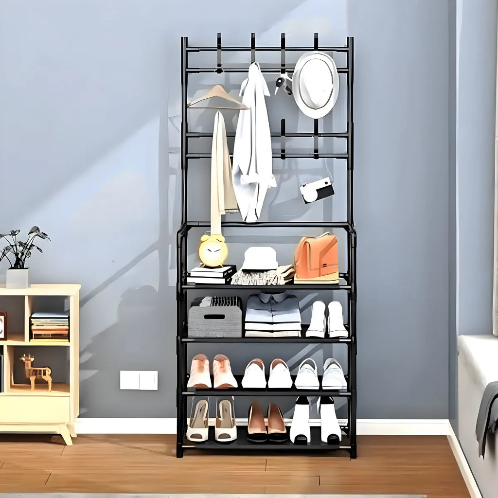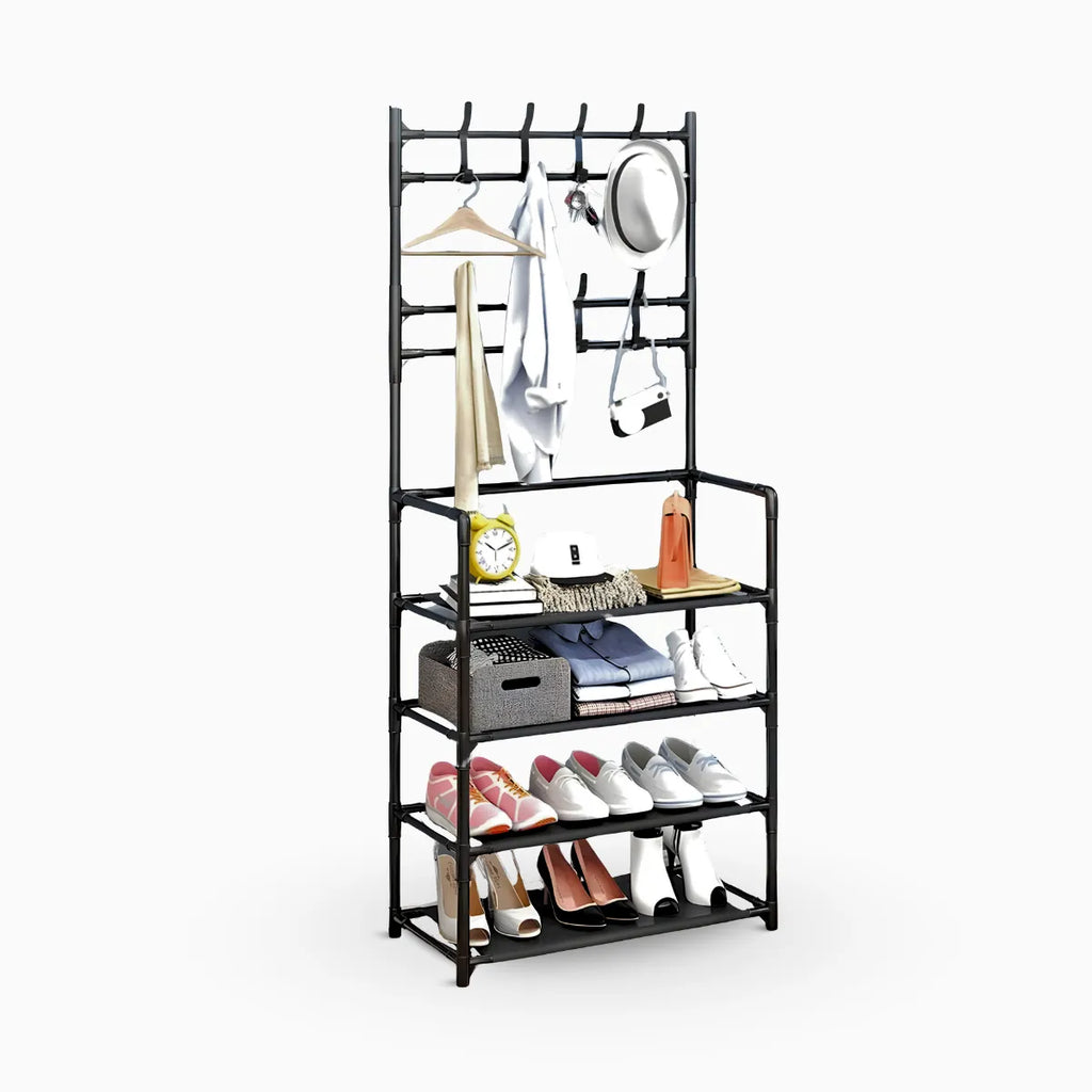 - Estrutura Robusta e Durável: Fabricada em ferro de alta qualidade, a estrutura metálica oferece grande resistência e durabilidade, suportando o peso dos objetos armazenados. O design combina o cabideiro para roupas e o suporte para sapatos de forma funcional e eficiente.