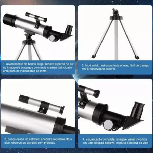 Fácil Instalação: Ideal para iniciantes e crianças, o telescópio pode ser montado rapidamente sem a necessidade de ferramentas, facilitando o uso desde o primeiro momento.